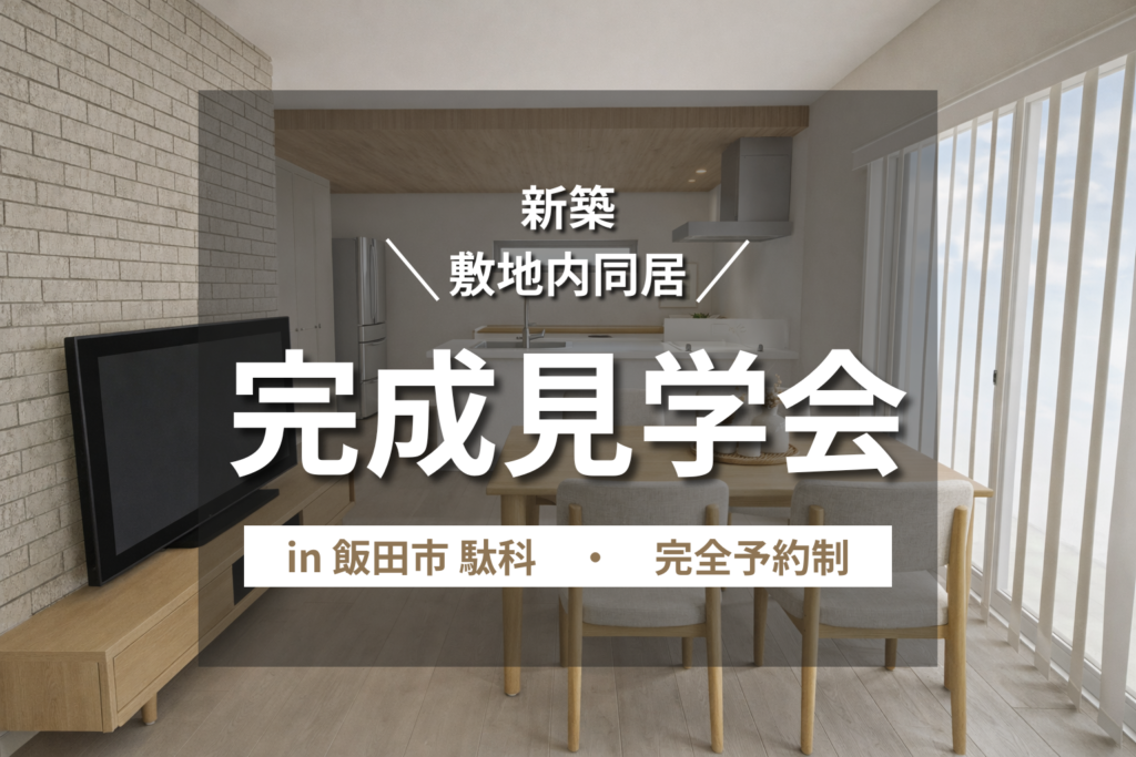新築完成見学会のお知らせ エアコン1台で冷暖房できる、これからの暮らしにちょうどいい住まい 3/28(土)・3/29(日) 10:00〜16:00|駄科会場事前予約制 「これから家を建てたい」「親世帯・子世帯が心地よく暮らせる住まいを考えたい」「敷地内同居も視野に入れて間取りを参考にしたい」 そんな方にぜひご覧いただきたい、新築完成見学会を開催します。 今回ご見学いただけるのは、 エアコン1台で冷暖房できる快適性と、将来の暮らし方の変化にも対応しやすい間取りを両立した住まいです。 毎日の暮らしや