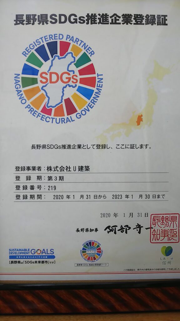 この度、株式会社U建築は、「長野県SDGs推進企業」として登録をされました。