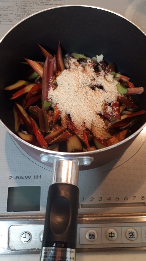 ルバーブ:砂糖=3:2に水大さじ1杯の割合で出来ます。