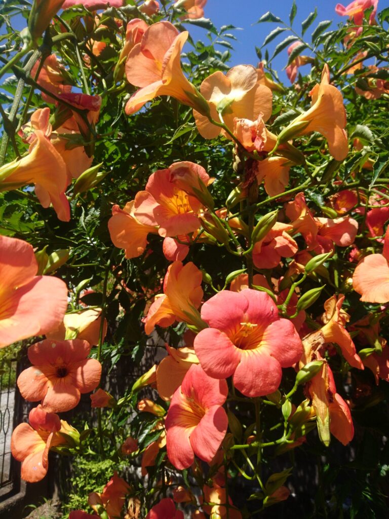 今年は梅雨入り前から気温が高かったせいか例年より早く庭のノウゼンカズラが開花しました。