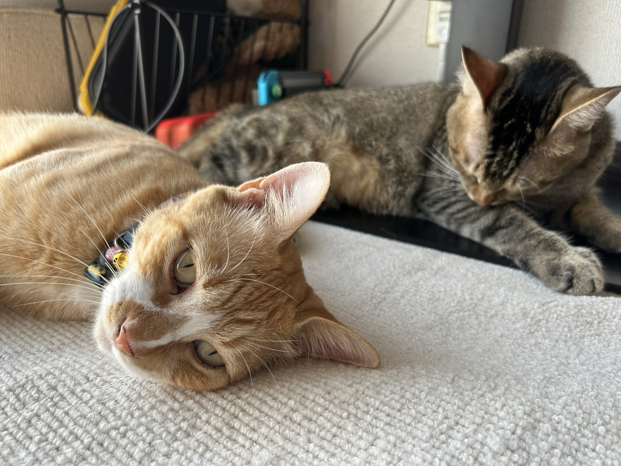 (手前:保護猫ちゃちゃ 奥:先住猫むぎ)