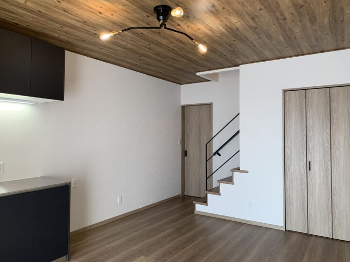 木目の天井に、ブラックのキッチンや照明。
