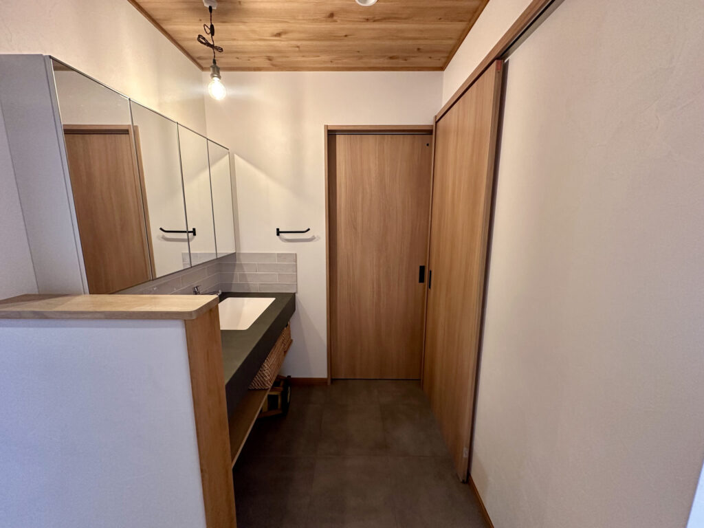 洗面は、家族が並んでも使いやすいゆとりのある広いタイプを採用。