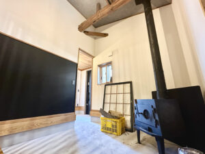 土間ならではの素材感が、薪ストーブの存在をより引き立て