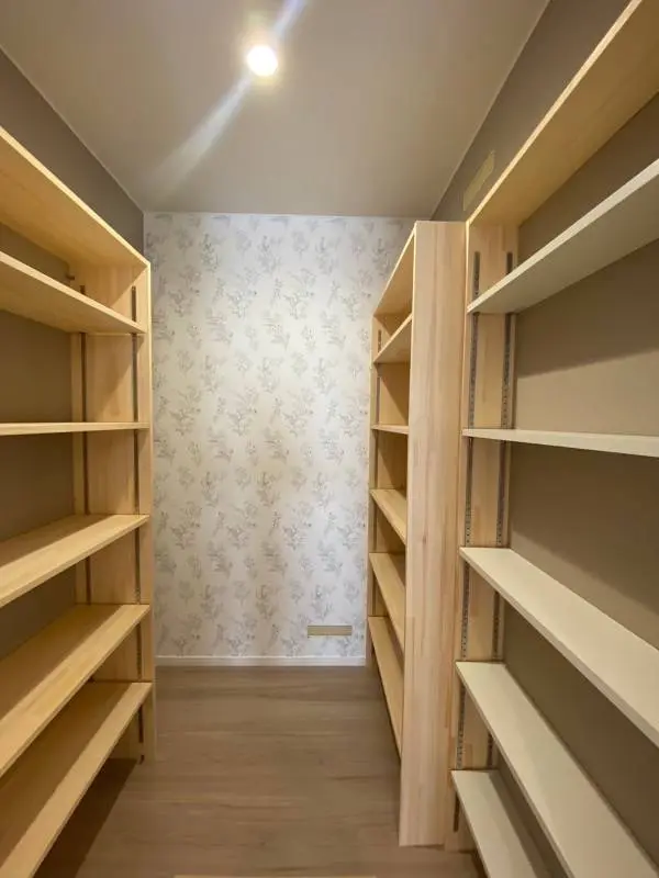 キッチン横のパントリーは、可憐な花柄のアクセントクロスが洗練された雰囲気に。