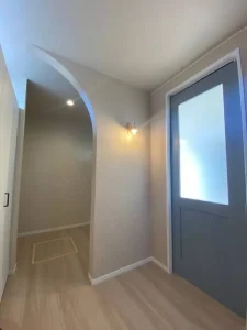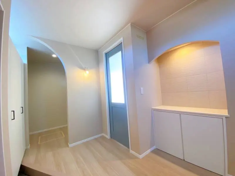 差し色のブルーグレーオークの建具が印象的に出迎えてくれます。