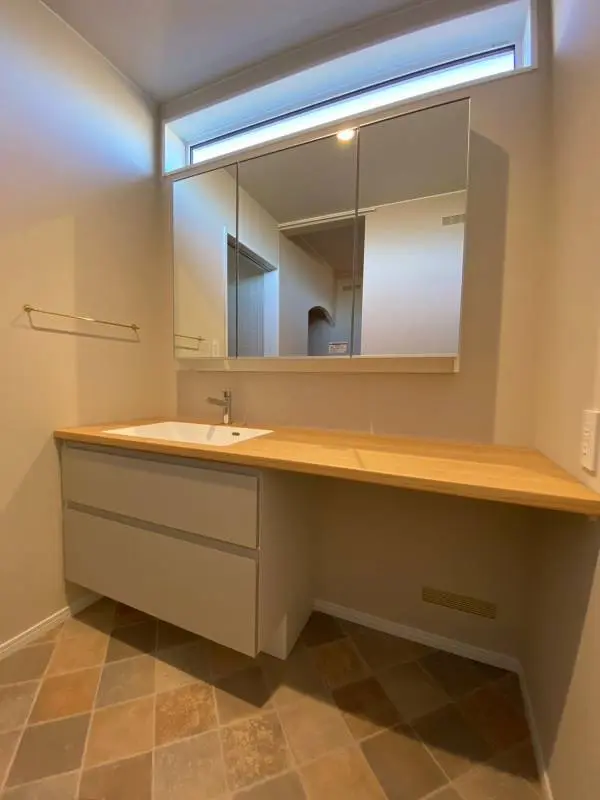 洗面カウンターの美しい木目調と収納面材のグレージュが絶妙なバランス。