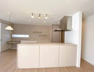 カウンター収納はミルクティを思わせる面材の色でやわらかな存在感。