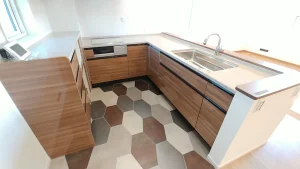 玄関先テラス下は全面タイル貼りです。 特注品のU字型キッチンと床にはカラフルなタイル調の床材をアレンジしました。 ダイニングの床はスキップしている為、立体的な空間が演出出来ます。 室内はカントリー調のデザインに合わせて梁を表しにしました。