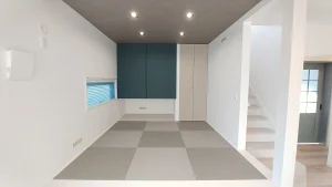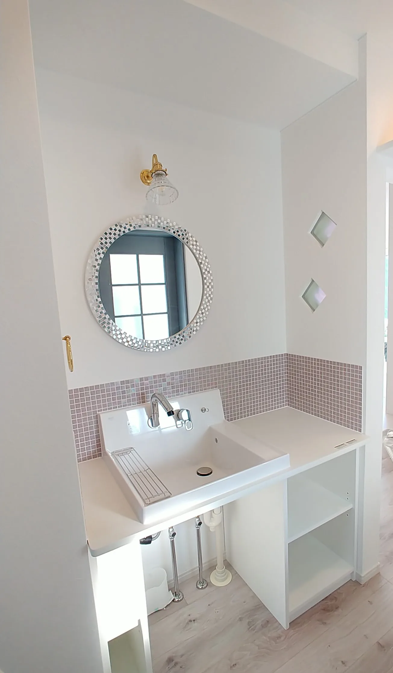 玄関先は広く屋根で覆われており雨が降っても玄関先が濡れません。 エアコン1台で冷暖房出来る家だからこそLDKは仕切りが全くなく広い大空間を実現。 キッチンはホワイトで統一され、収納も細かく設置されています。 小上がりのタタミコーナーはモダンにデザインしました。 ハンドメイドの洗面は可愛くお洒落なデザインになりました。 洗濯物専用のランドリースペースで部屋干しもOKです。