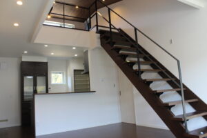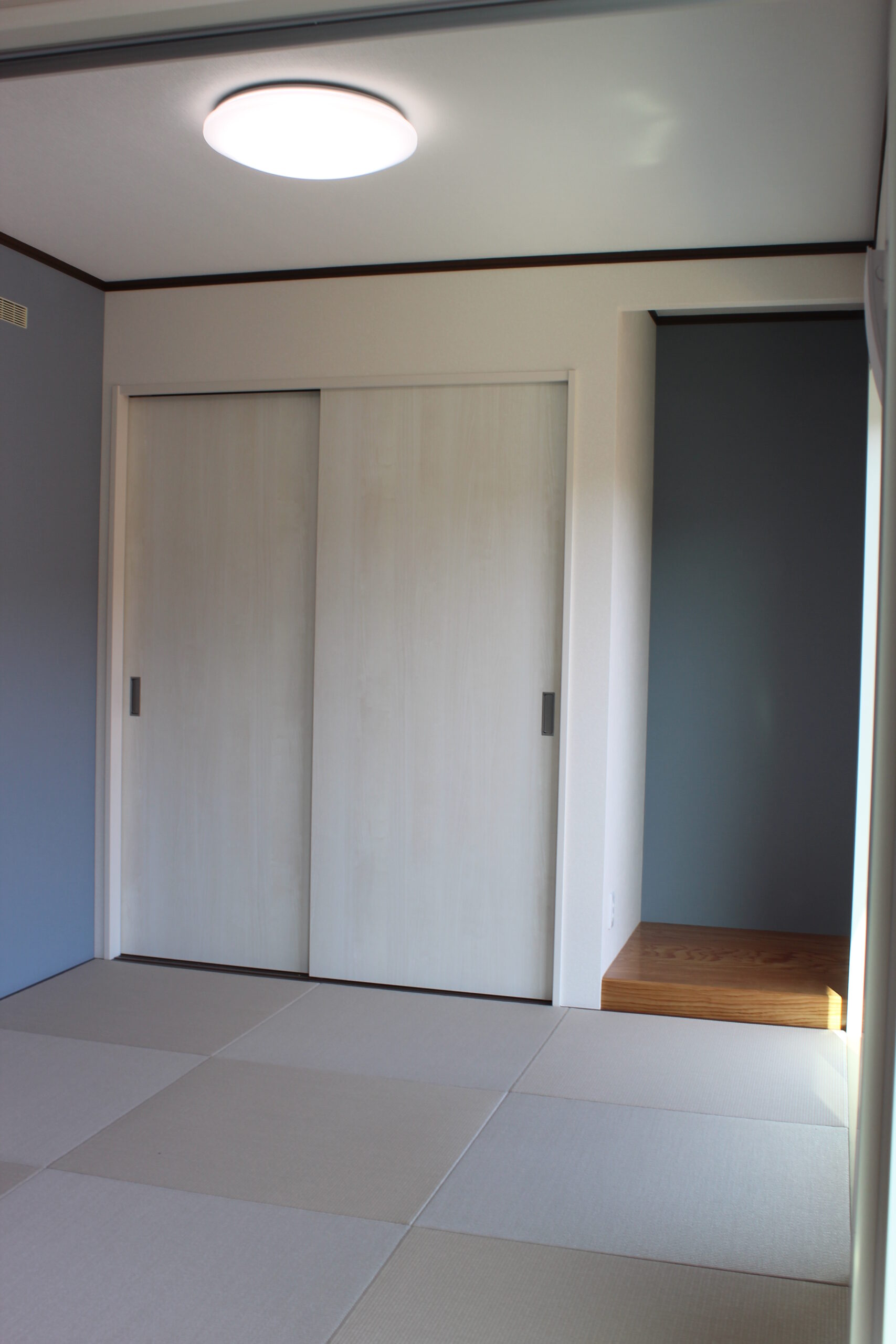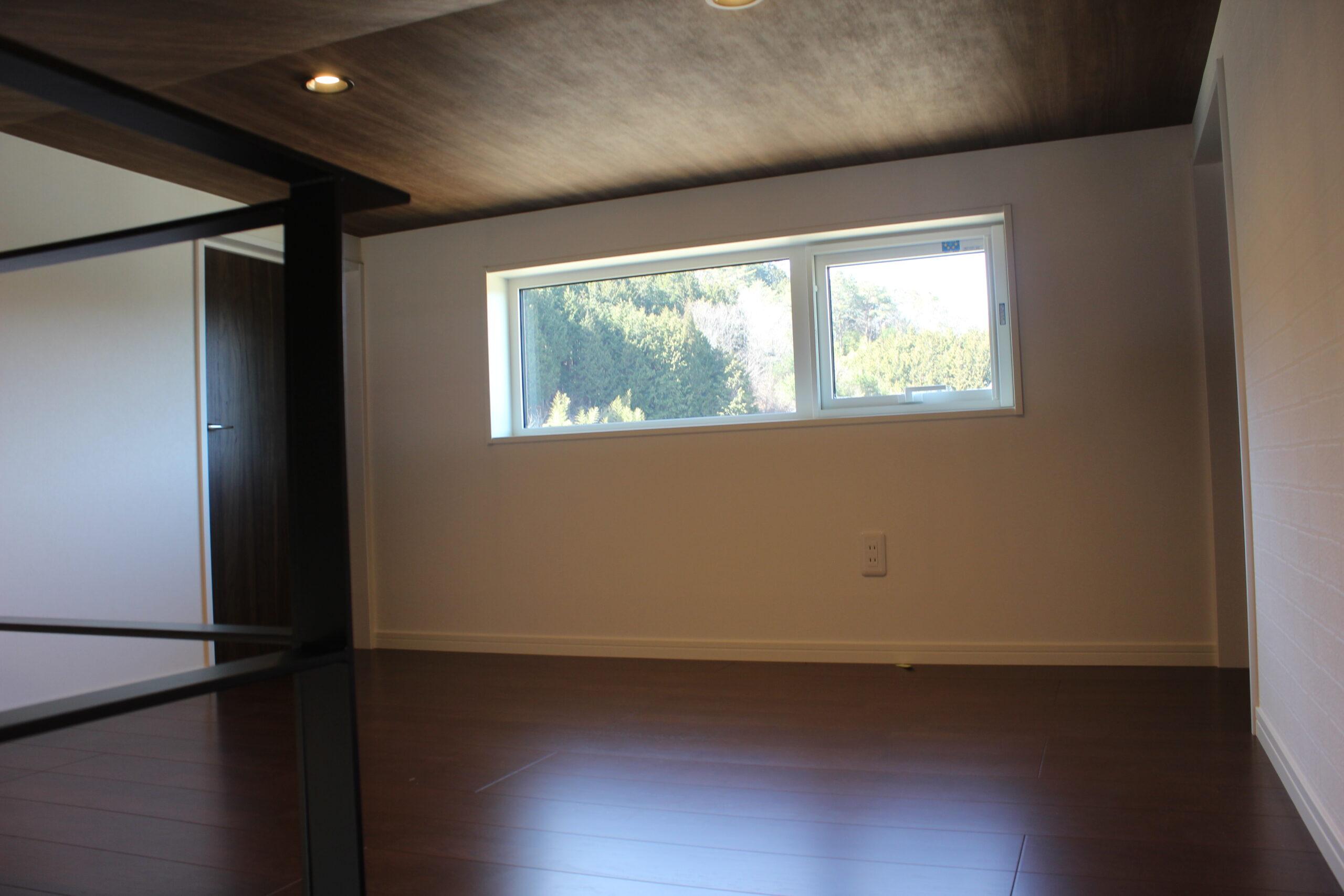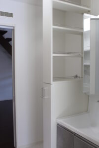 スタイリッシュなアイアン手すりのロフト階段。吹き抜けも解放感抜群です。 平屋を感じさせない大空間。 広いロフトは多目的に使えるスペースになります。 和室では、ゆっくりとお過ごしいただけます。 洗面所の収納。洗剤やタオルに便利です。