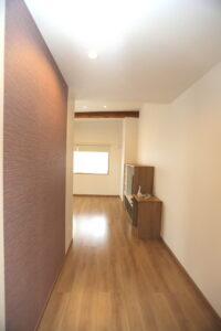 寝室への入口は 赤茶のクロスがアクセントです。
