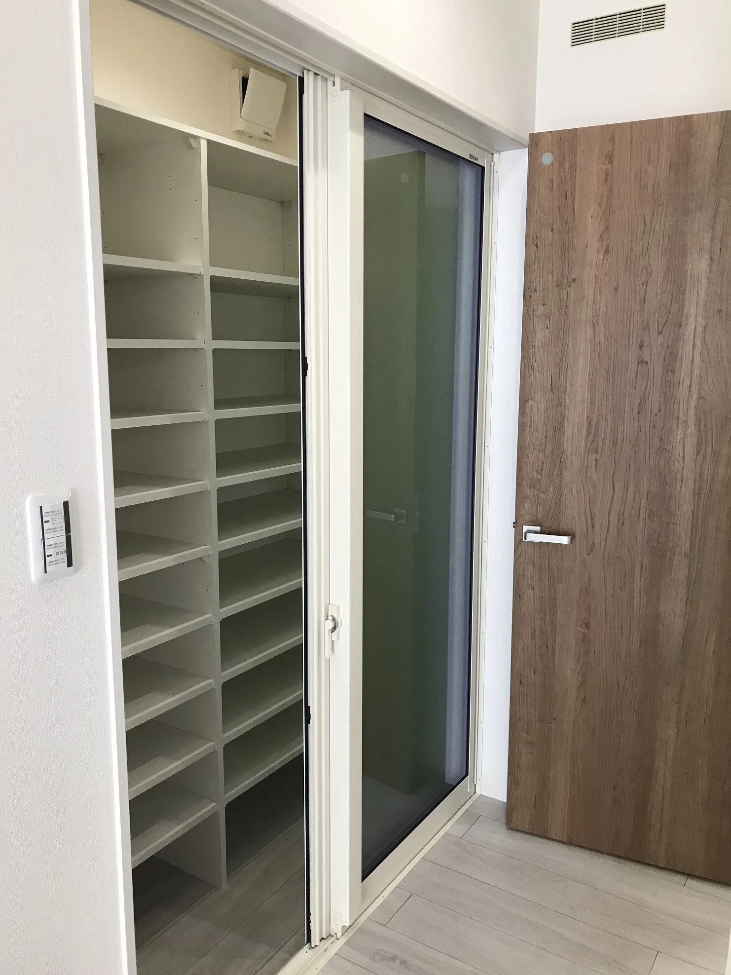 パントリーには可動式の収納棚が設置されています。右手の扉はランドリースペースにつながっていて、スムーズな家事動線が確保されています。