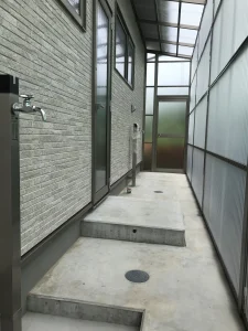 バックヤードです。手前は散歩から帰ってきてわんちゃんの足をすぐに洗える足洗い場。