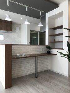 食事を楽しんだり、作業もできるダイニングカウンター。脇にはインテリアカウンターがあり、写真などを飾っていただけます。