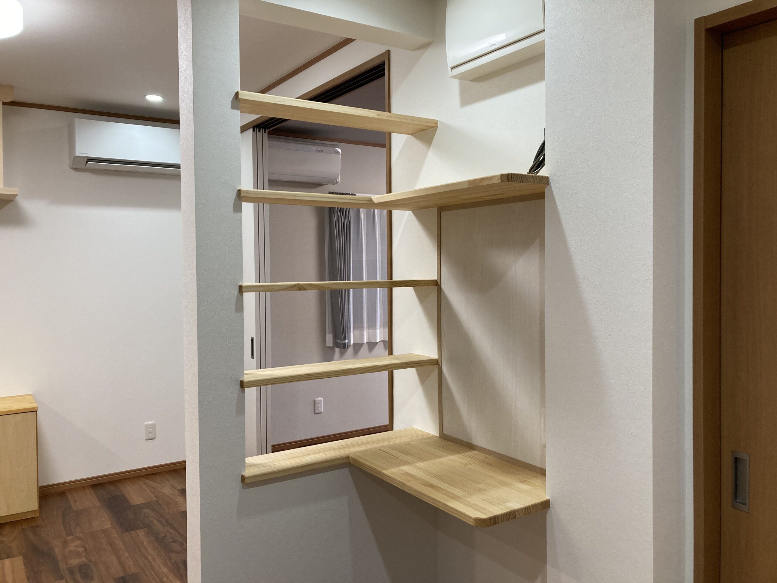 リフォームでは設計上取れない柱が出てきます。今回はそんな柱を利用して飾り棚を作り、パソコンスペースにしました。
