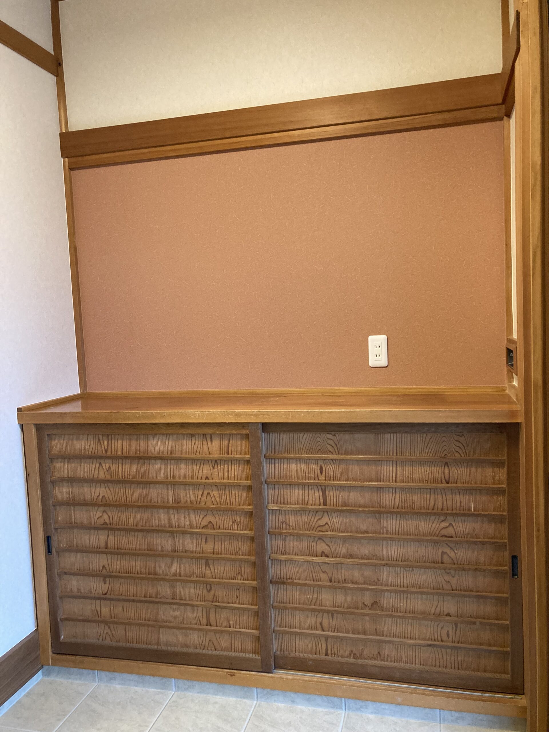 靴箱・天井はそのままですが、違和感なく馴染み落ち着いた雰囲気にまとまっています。ポイントは壁の色を白くしすぎないこと、床材とその他の木の色を合わせることです。